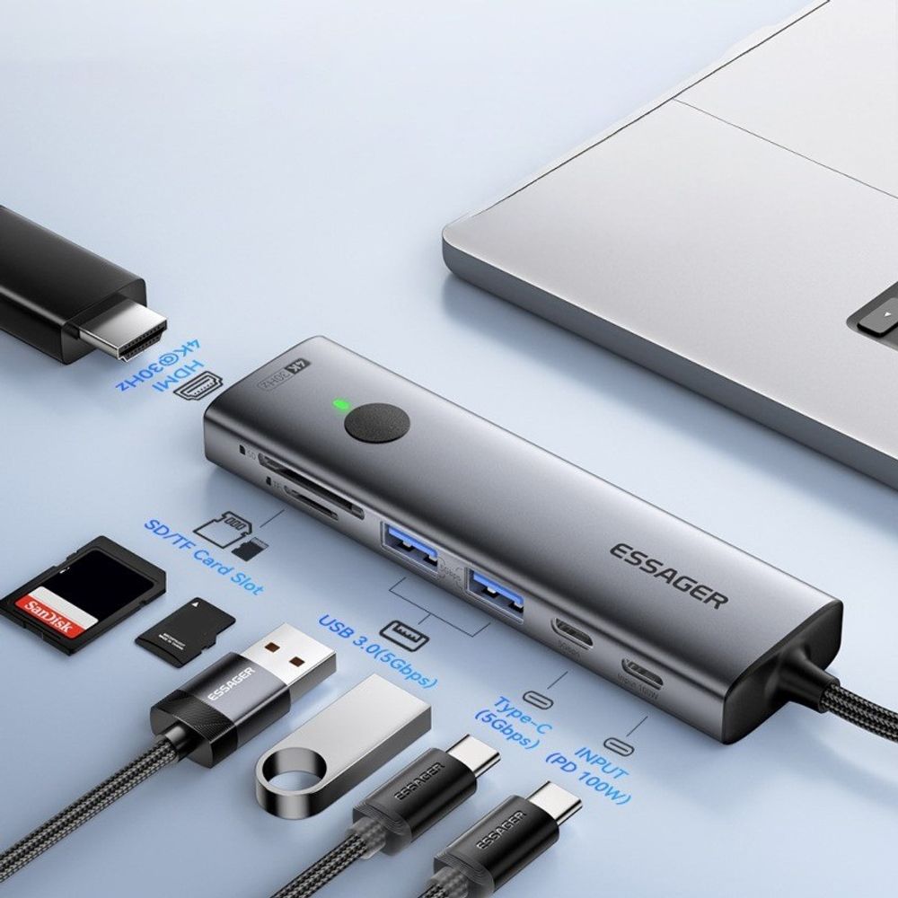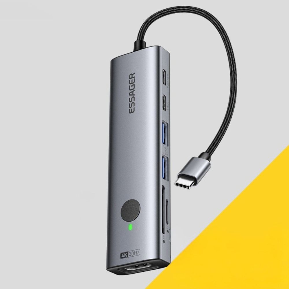 Adaptador Essager 7 em 1 USB-C/HDMI/USB/SD ES-HB03 Cinza