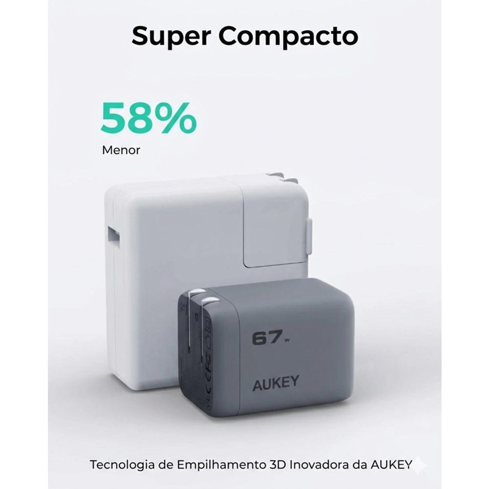 Carregador de Viagem Aukey 67W PD com tecnologia GaN USB/USB-C PA-C3 Cinza